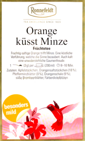 Apfelstückchen, Orangensaftstückchen (17,5 %), Pfefferminzblätter (8,7 %), Orangenschale (8,7 %), süße Brombeerblätter, Färberdistelblüten