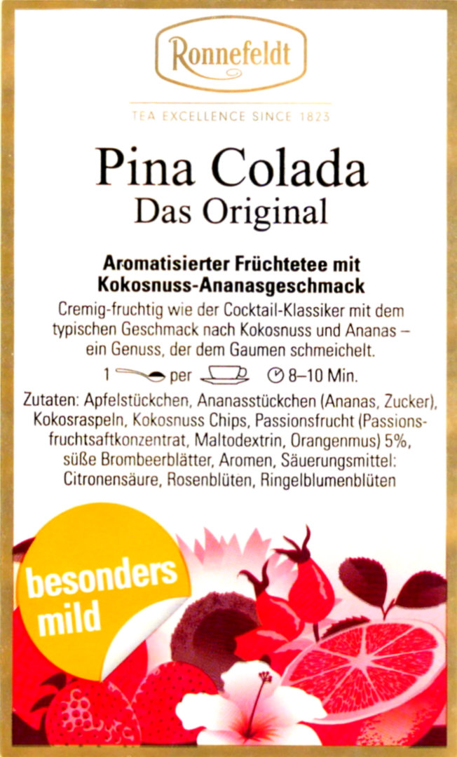 Cremig-fruchtig wie der Cocktail-Klassiker mit dem typischen Geschmack nach Kokosnuss und Ananas – ein Genuss, der dem Gaumen schmeichelt. Dieser Tee ist als „besonders mild“ gekennzeichnet, da er keinen Hibiskus enthält.