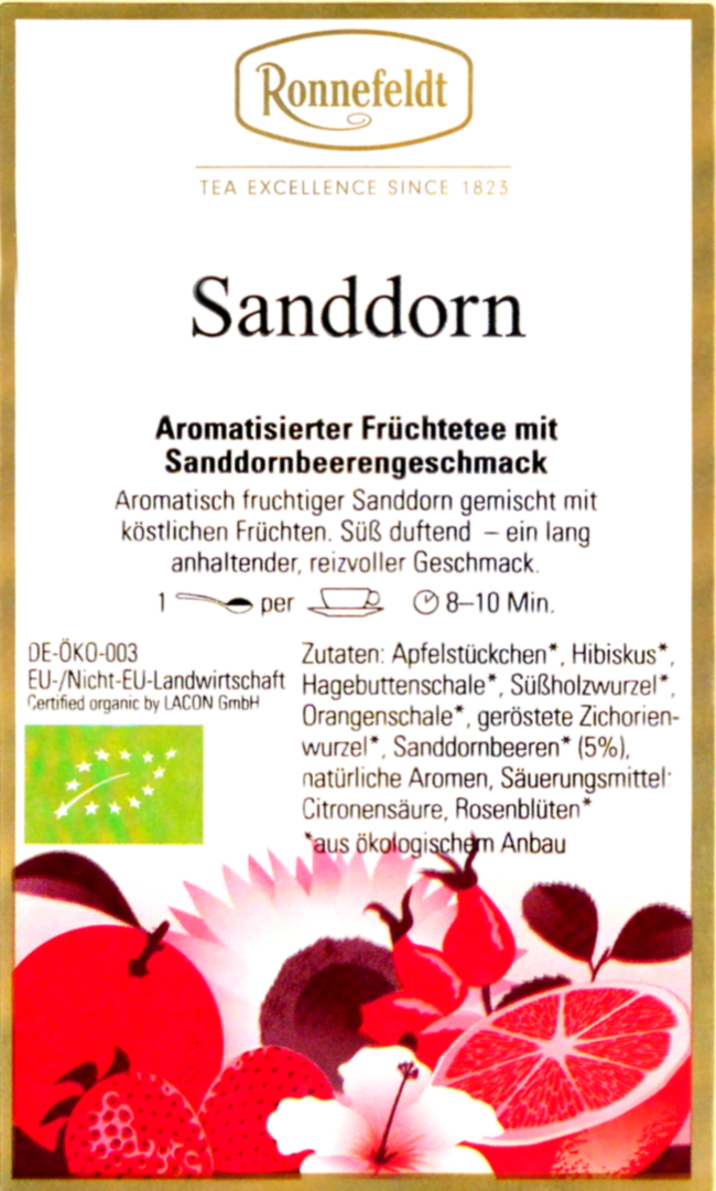 Ananasstückchen (Ananas, Zucker), Papayastückchen (Papaya, Zucker, Säuerungsmittel: Citronensäure), Aromen, Sonnenblumenblüten, Mangostückchen (Mango, Zucker), Rhabarberstückchen